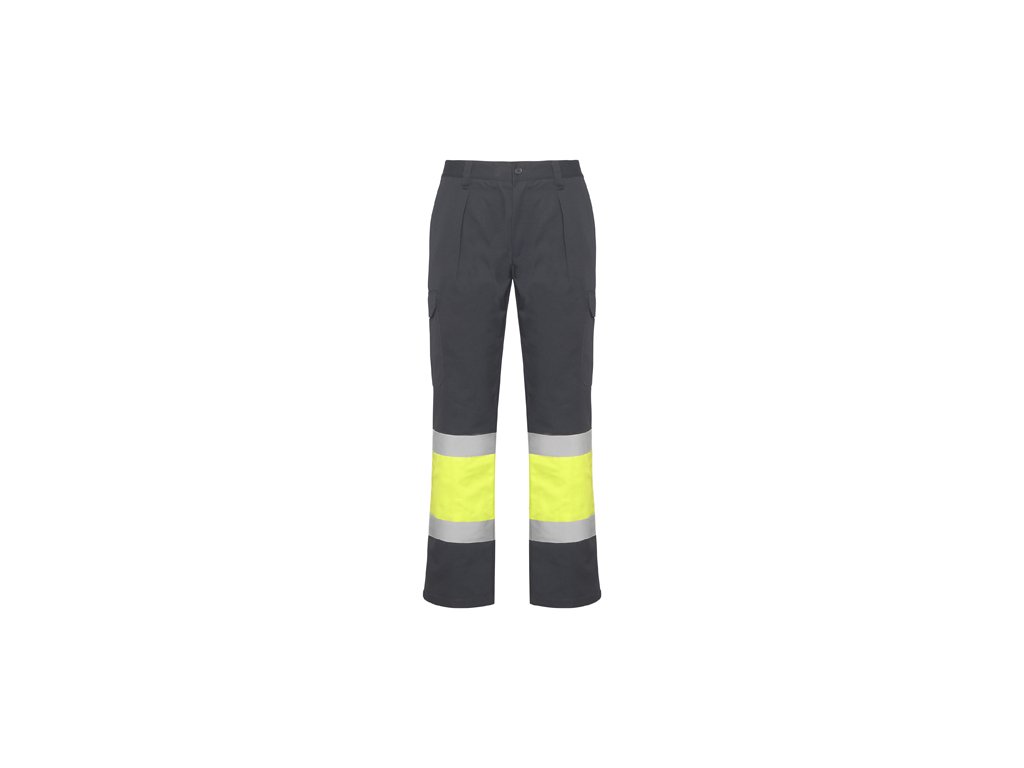 Multi-pocket high-visibility winter trousers. 1.- Elastic waistband at the back. 2.- Two back flap pockets with velcro fastening. 3.- Two front pockets and two side pockets with gusset and flap with velcro fastening. 4.- Two-colour combination with reflective strips.