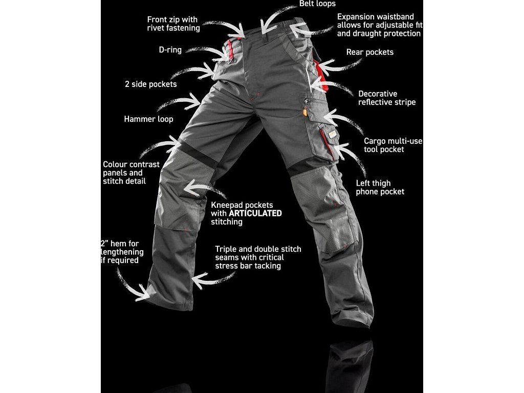 - Trojité prešitie, čiastočne zosilnené švy so špeciálnym stehom na vreckách a namáhaných bodoch