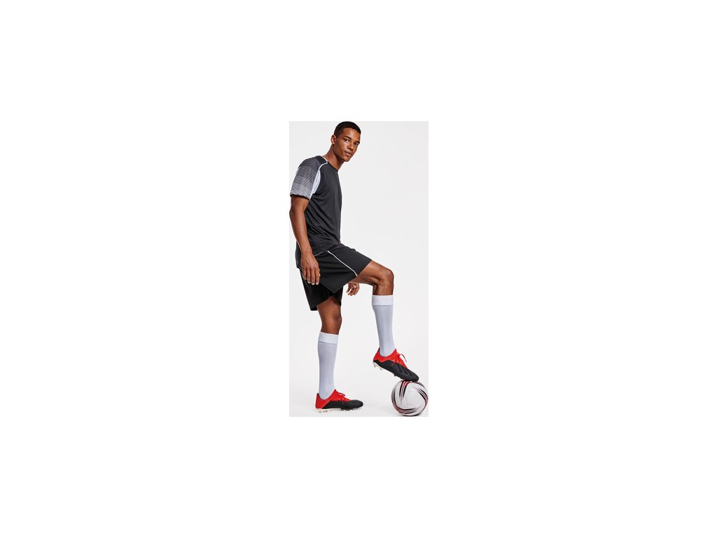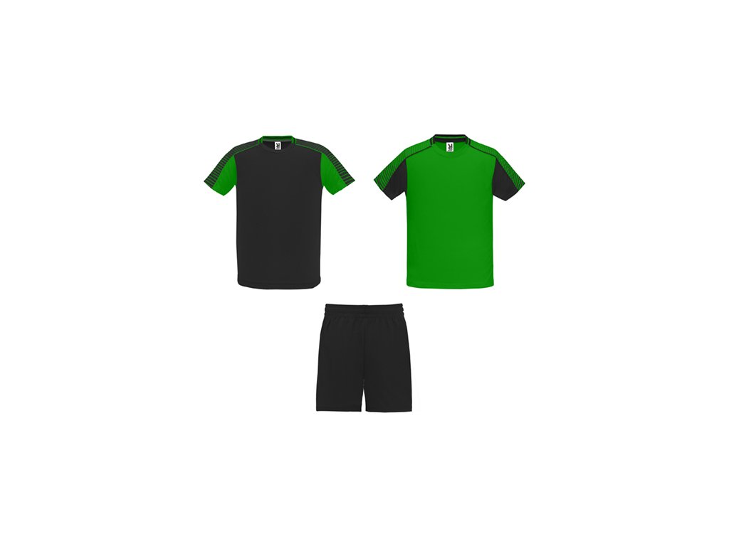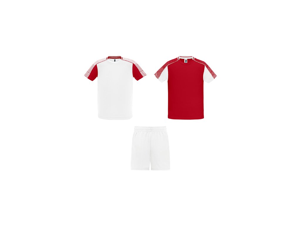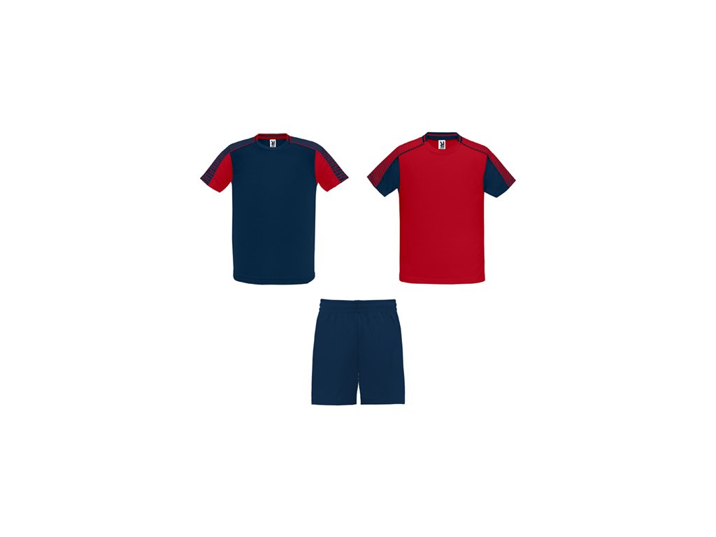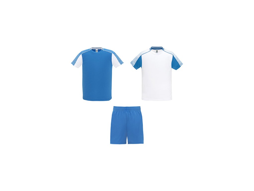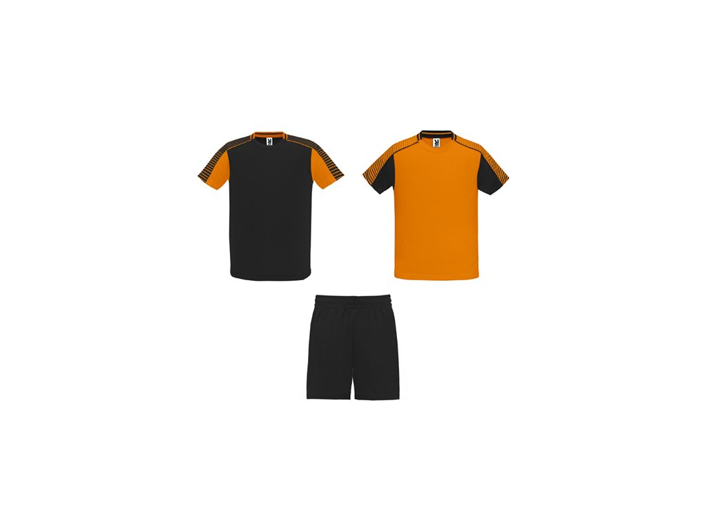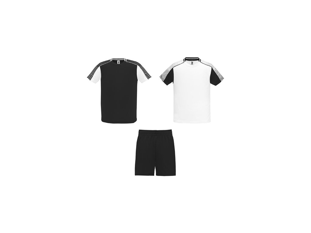 Unisex športová súprava z 2 tričiek a 1 páru nohavíc. 1. Tričká so semiraglánovými rukávmi s potlačou. 2. Okrúhly výstrih s trikotovým lemovaním na zadnom dieli. 3. Farba druhého trička je komponovaná opačným spôsobom. 4. Nohavice s elastickým opaskom so šnúrkou vo vnútri tón v tóne a s ochranným štepovaním. 5. Kontrastný bočný pás a bočný rozparok na spodnom okraji nohavíc.