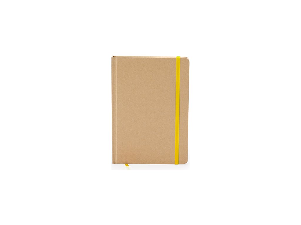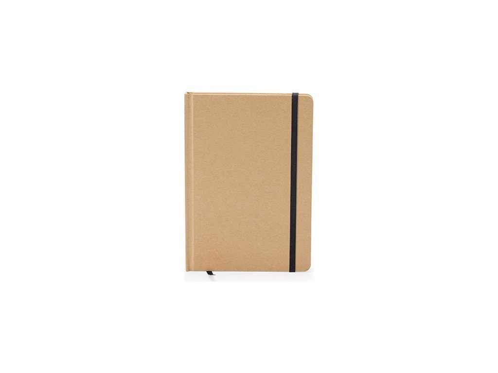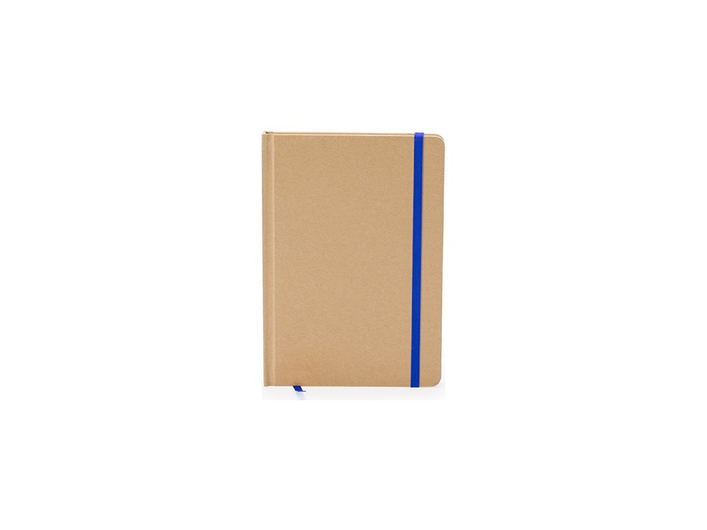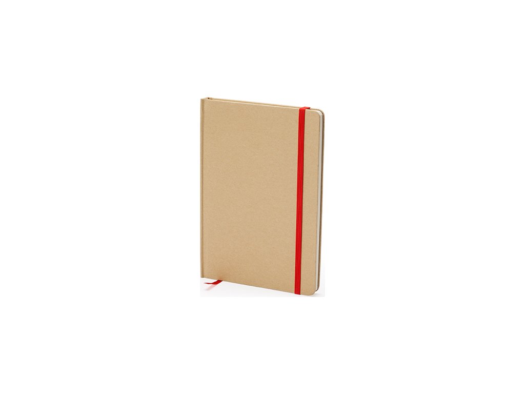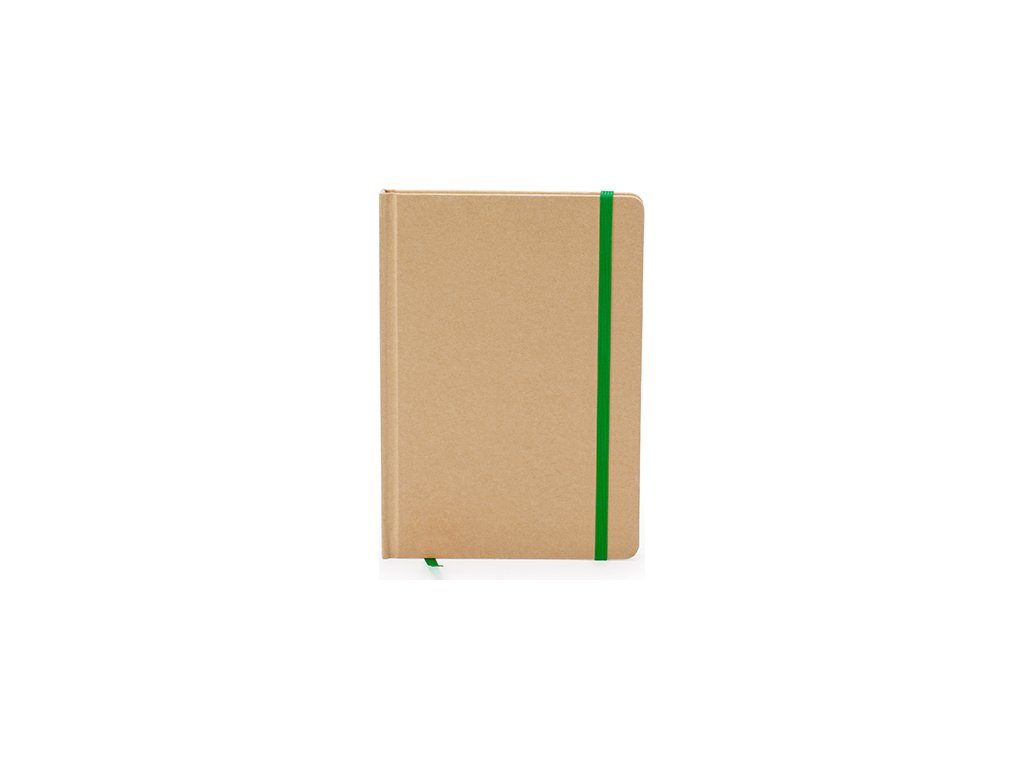 Poznámkový blok A5. Pevné obal z recyklovanej lepenky. Záložka a farebná gumička. 100 listov.