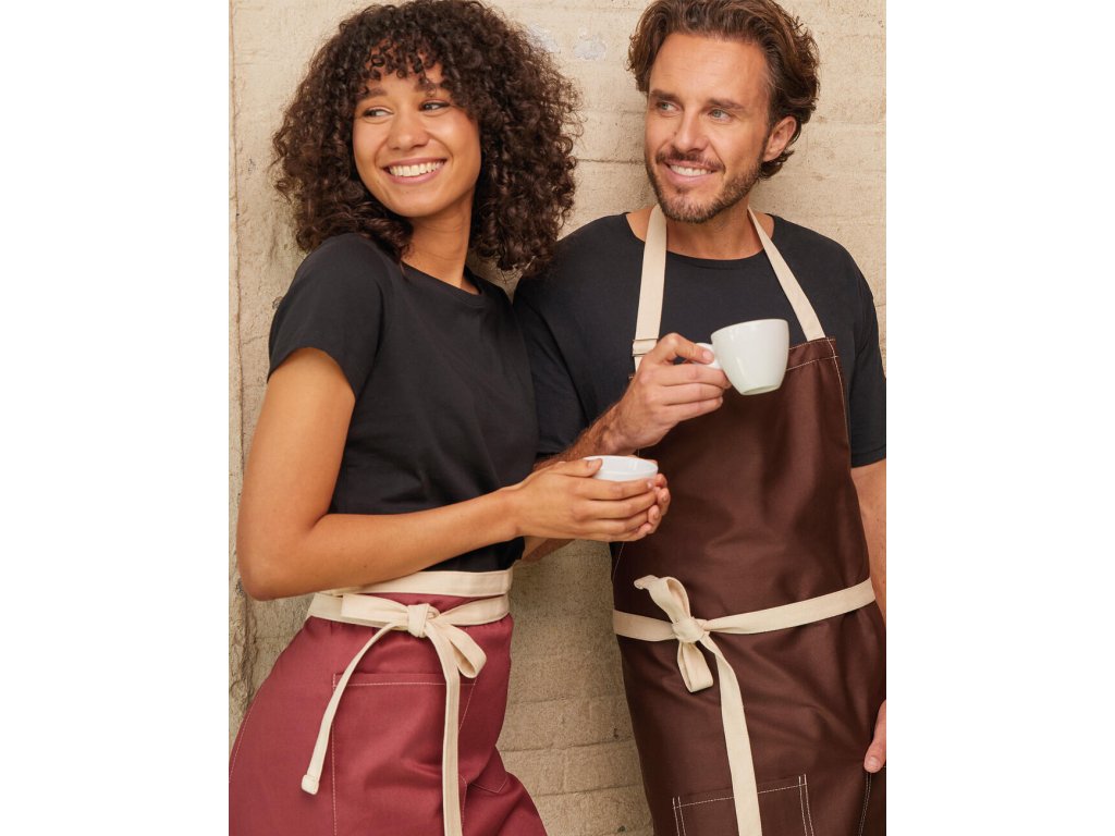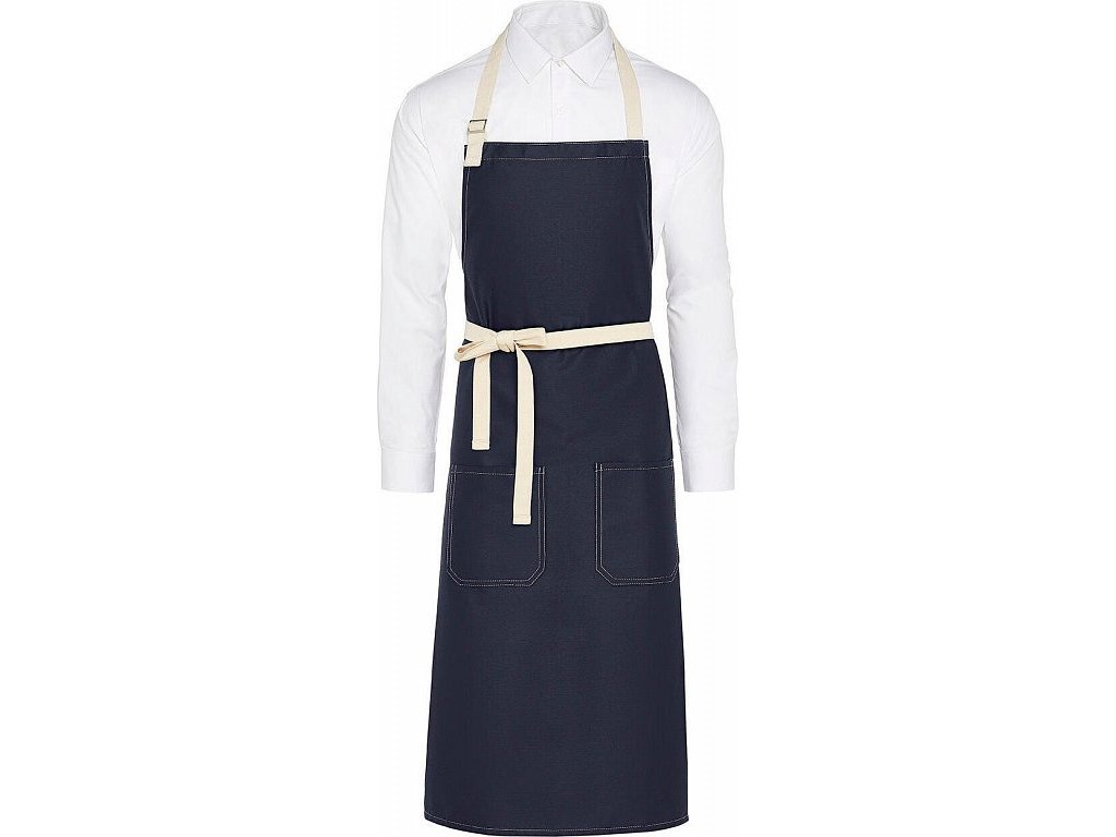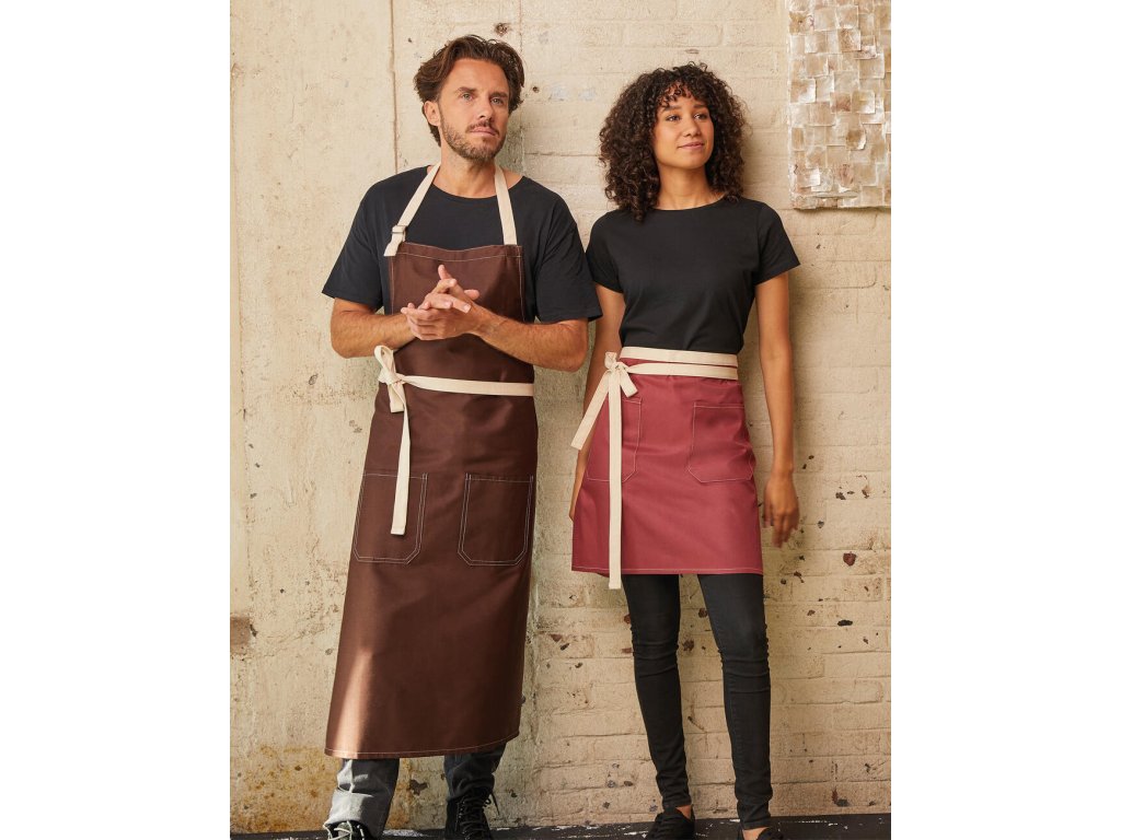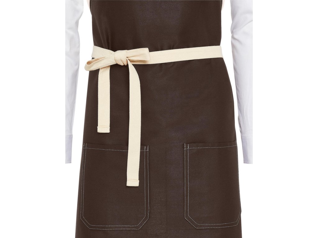 - Trendová zástera s kontrastným farebným prešívaním a pásom