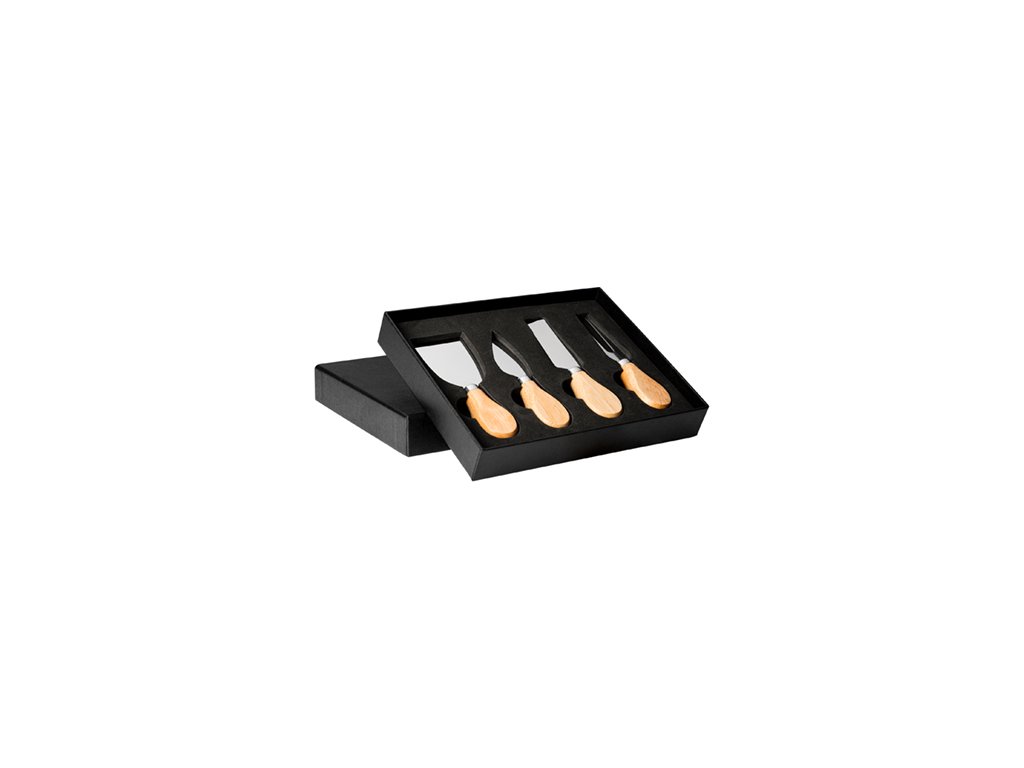 Syrová súprava so 4 príbormi z nehrdzavejúcej ocele a drevenou rukoväťou. Prezentácia v elegantnom puzdre s vnútorným polstrovaním.